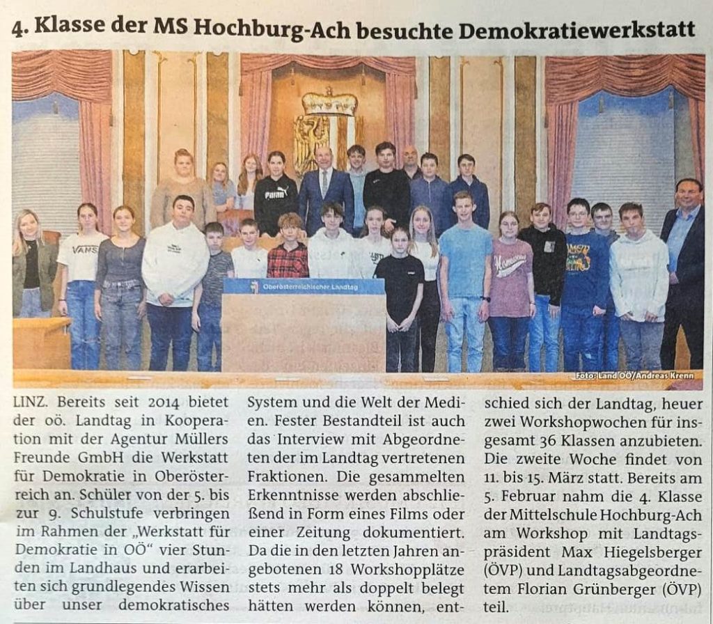 Demokratiewerkstatt Am 5. Februar 2024 war die 4b-Klasse zu Besuch im Linzer Landhaus. Zum Starten des Videos ins Bild klicken. Das könnte dir auch gefallen Wir sind Klimabündnis 22. Februar 2025 Meistersingerschule 4. März 2024 Bezirksjugendsingen und Meistersingerschule 9. März 2023